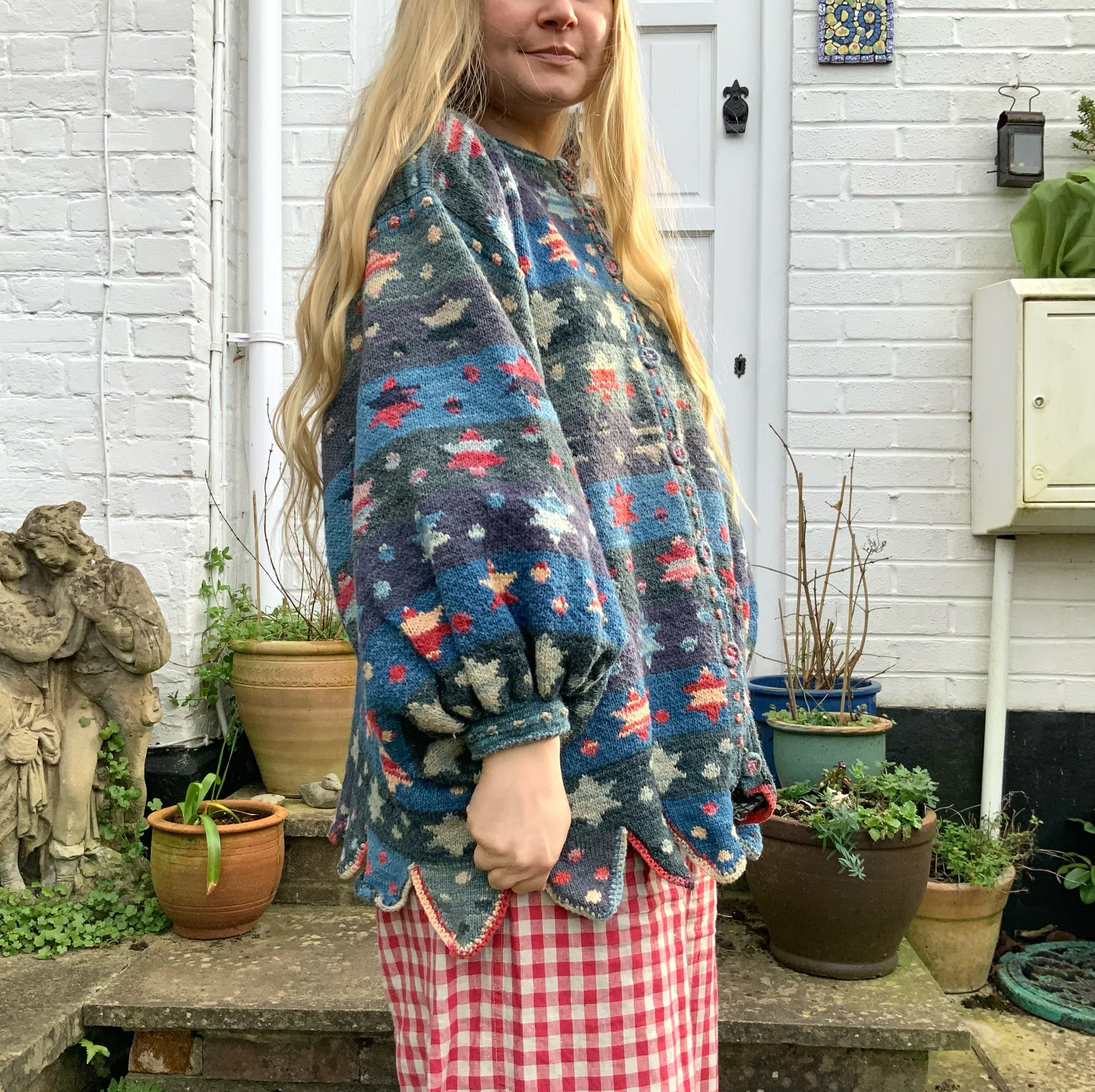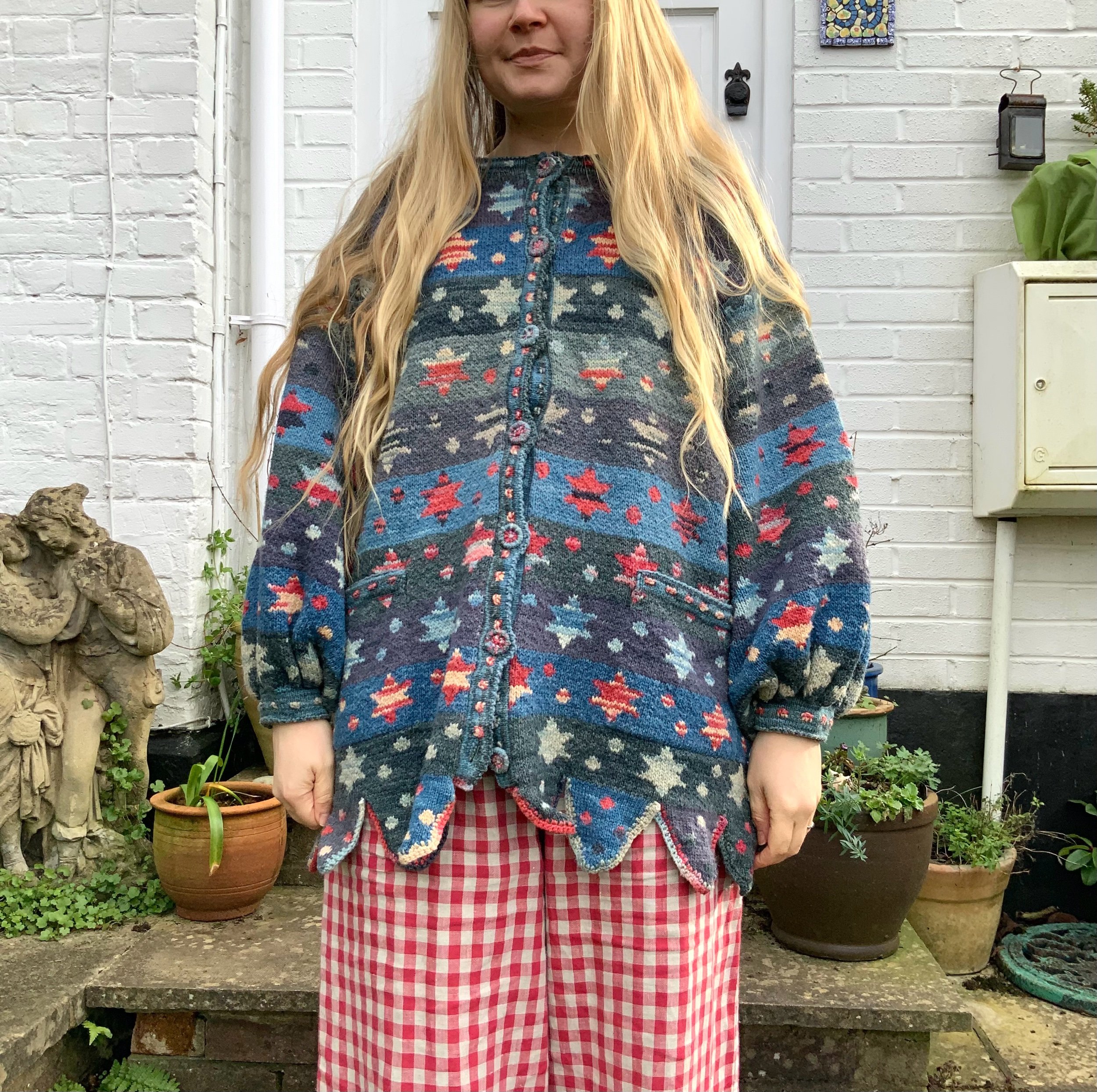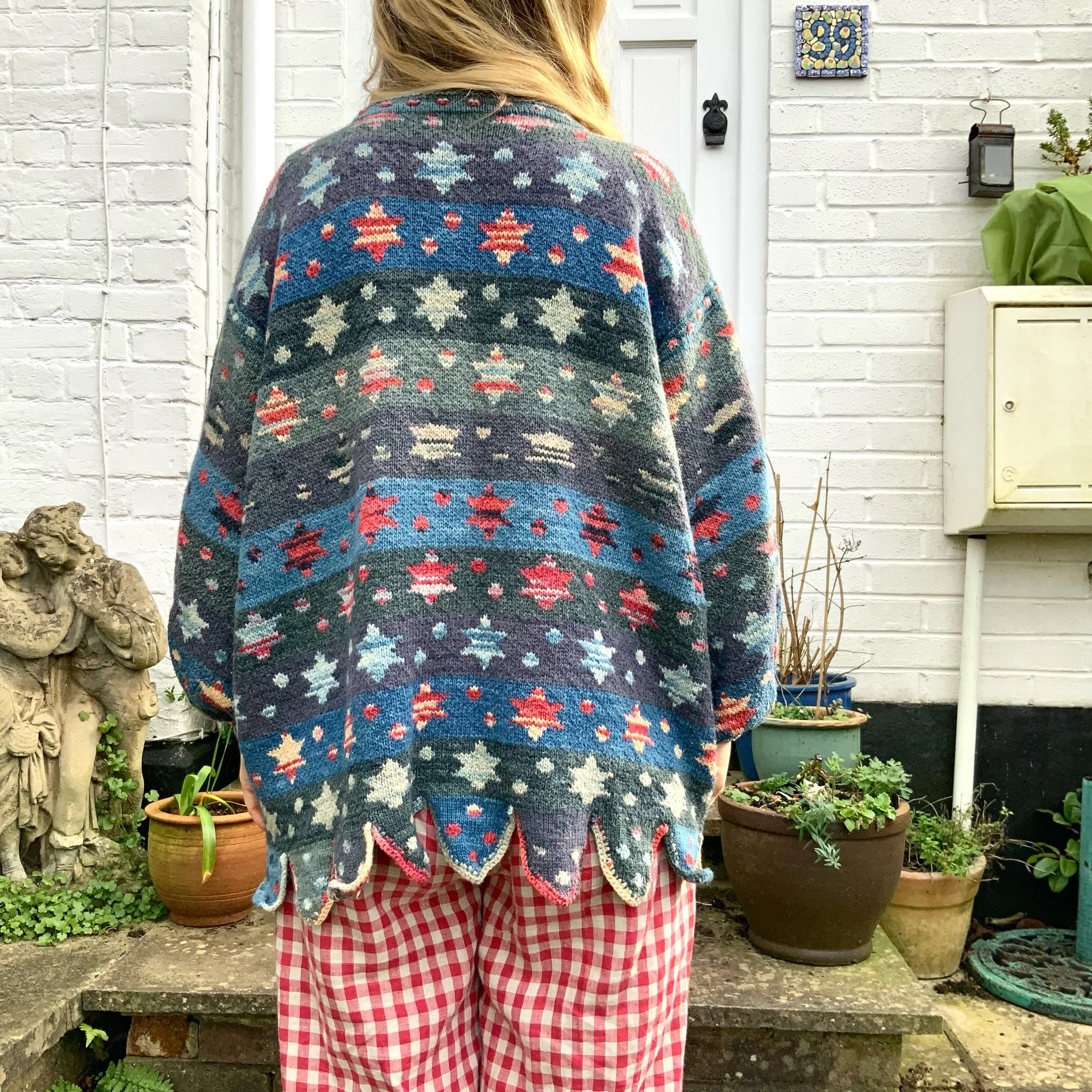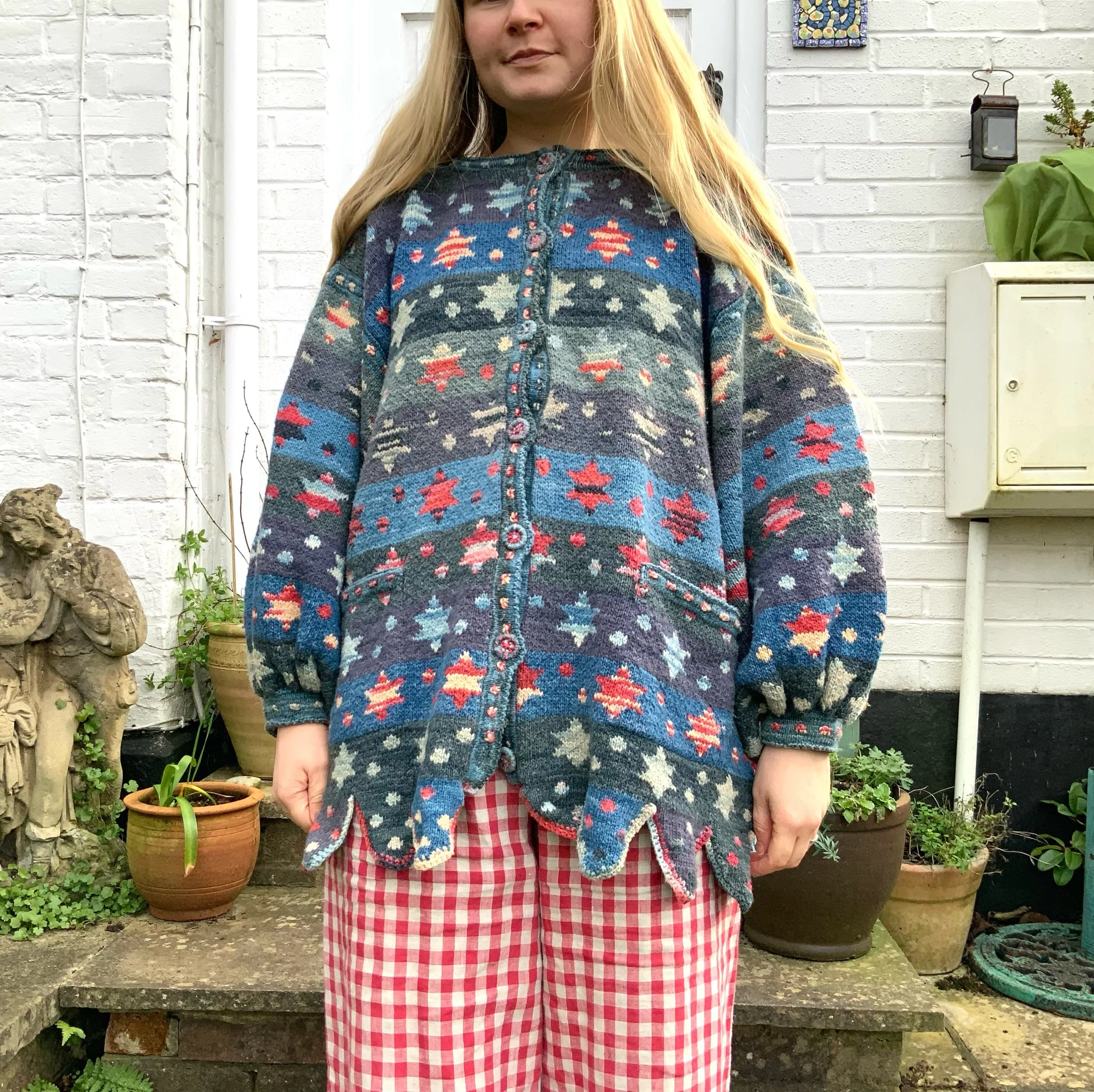 Hand-knitted rare starry cardigan! ⭐️ Looks very in the style of the Natural Dye Company (see last images) however there’s no label and it is slightly different to the pattern in their book. It’s likely to be a one off piece. Approx a size 2XL, shown on a size S, 5’4. Feels like it’s been made from natural wool. In great condition. 💙