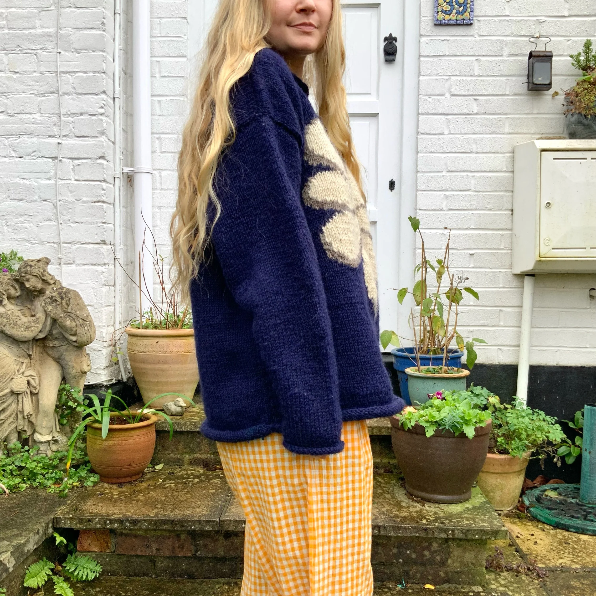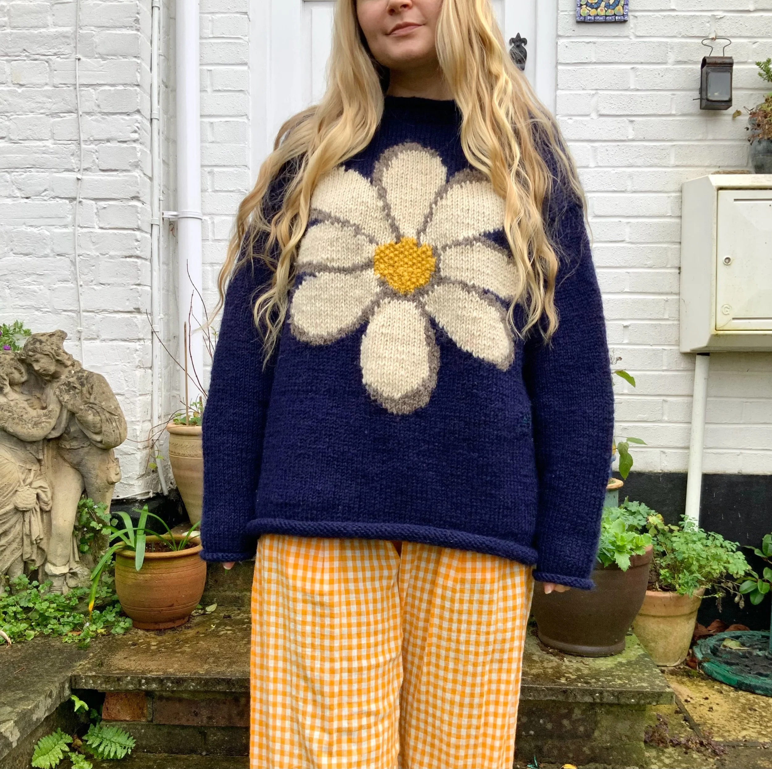A hand made floral knit made from chunky natural wool by the brand Pachamama. I would estimate that itโs around an XL, shown on a size S, 5โ4 height. Measurements below. :) In great condition, I have mended two areas shown in the last photos. ๐ผ