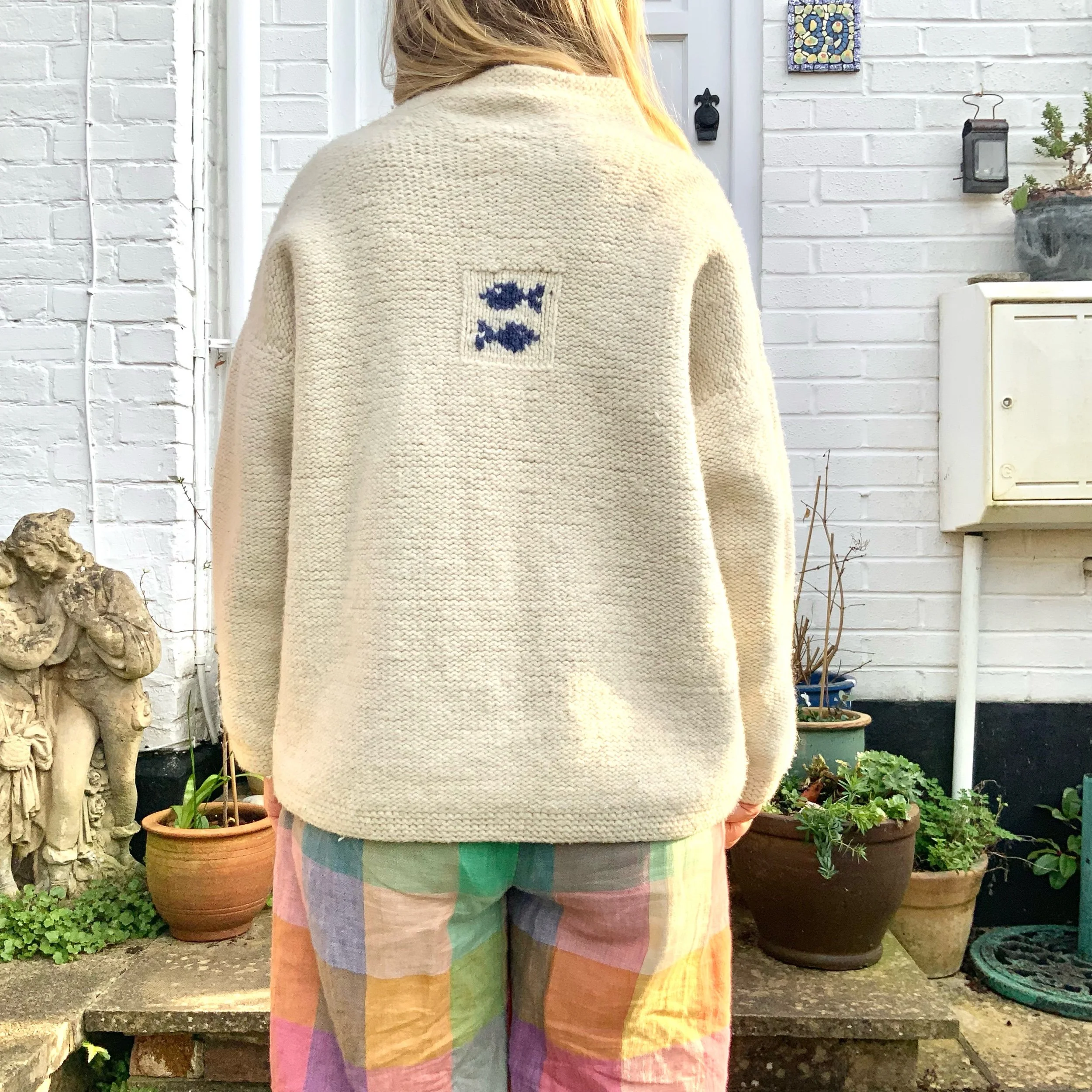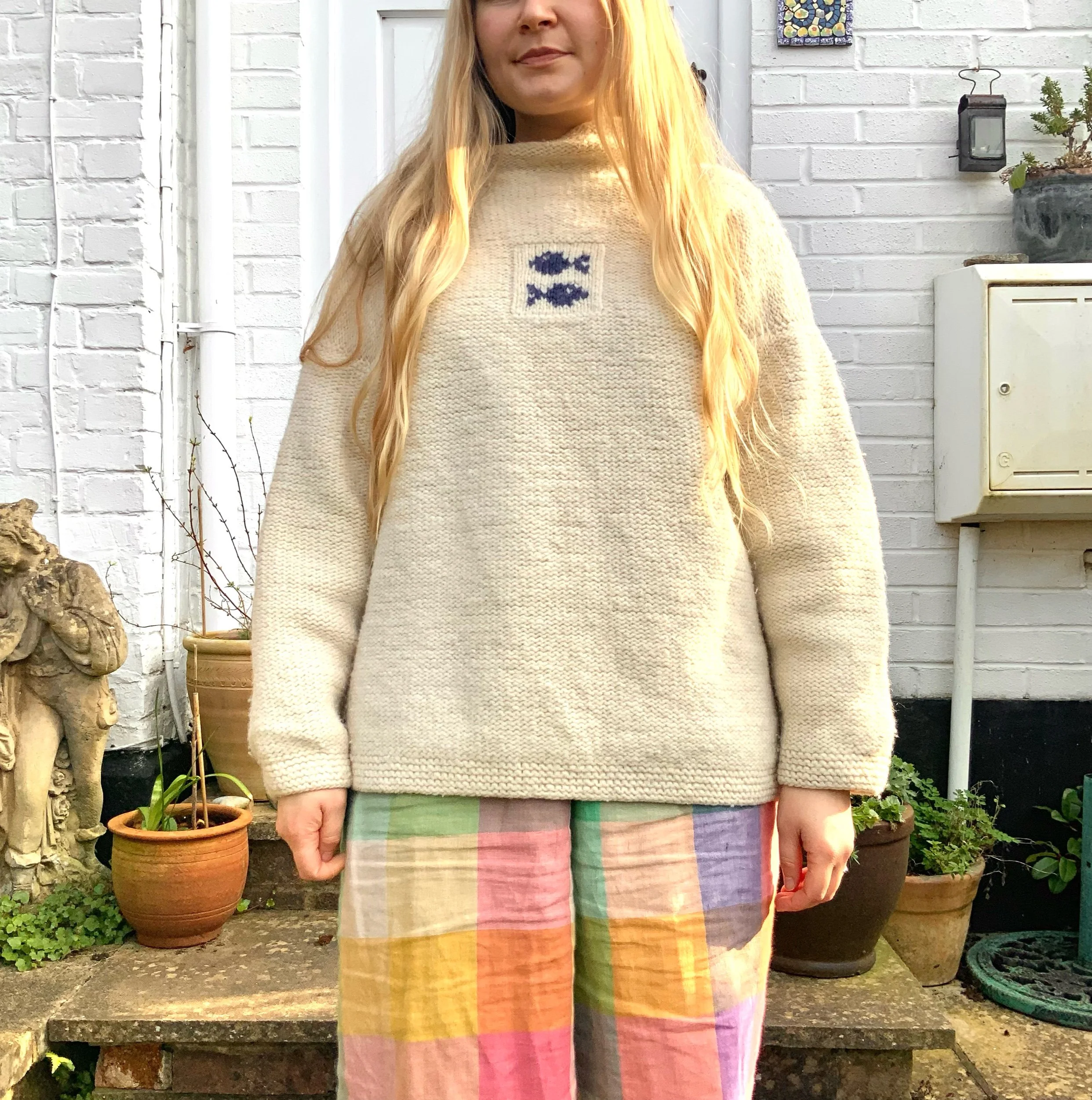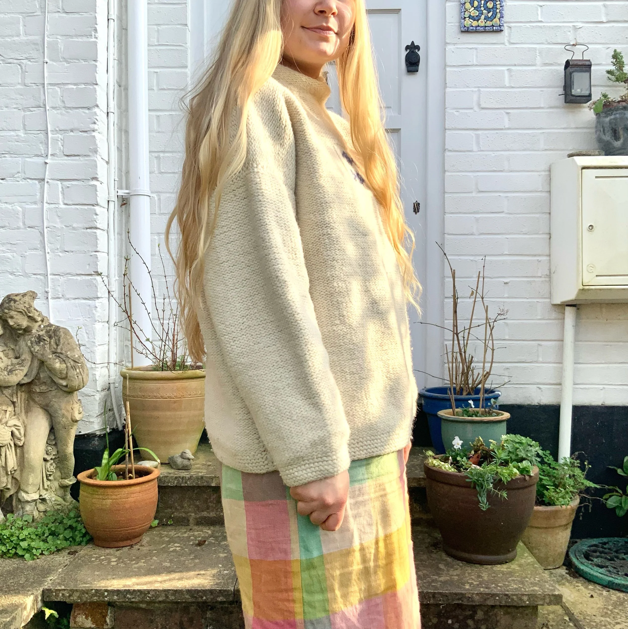 Handmade jumper by the brand Pachamama. π Iβd estimate that itβs around a size L, shown on a size S, 5β4 height. Measurements below. :) Made from chunky natural wool. In great condition, Iβve mended one small area on the back shown in the last photo. π