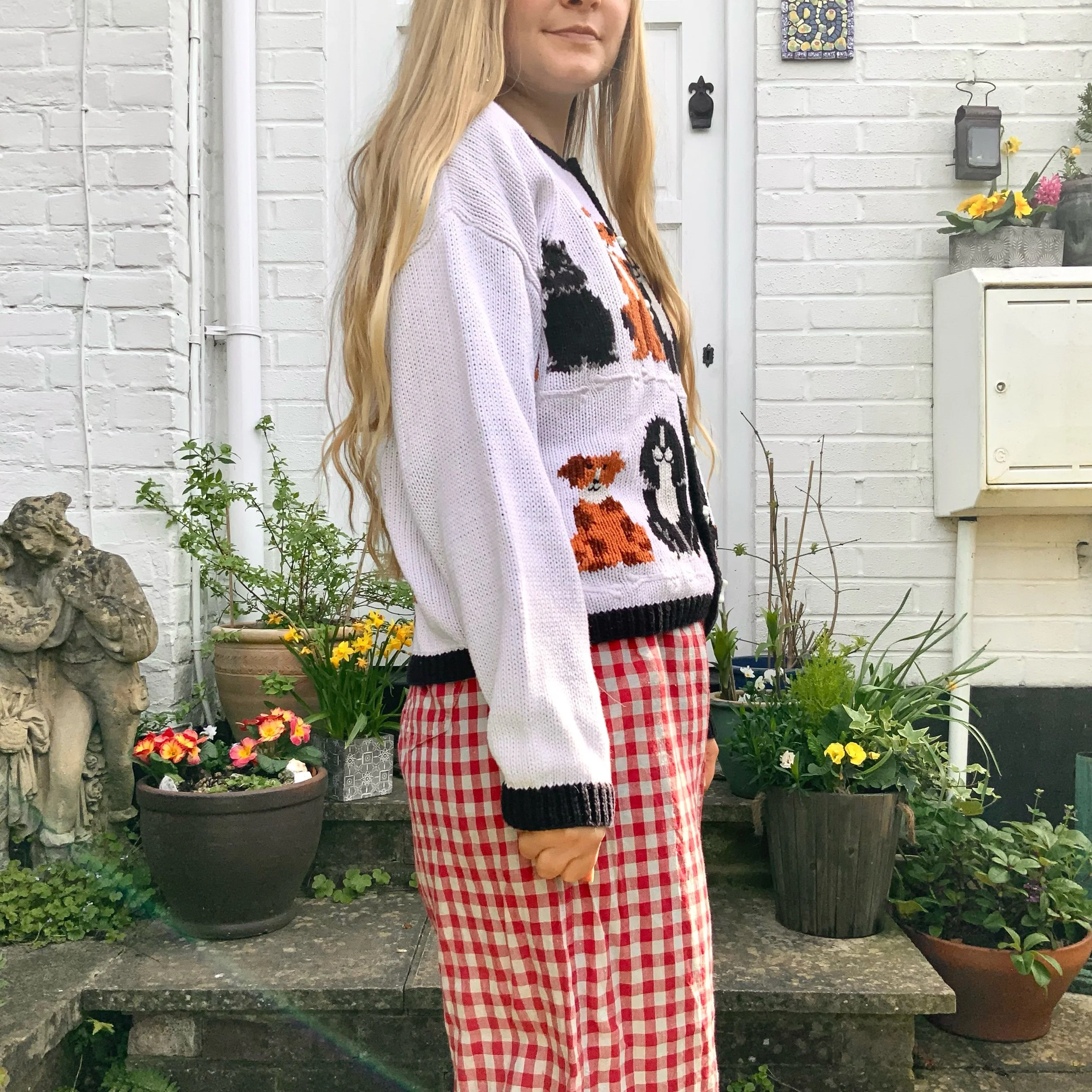 Cute vintage cardigan with dog motifs. 🐶 Made from 55% ramie and 45% cotton yarn by the brand Marisa Christina. Size M, measurements below. :) Shown on a size S, 5’4 height. In great condition. ✨