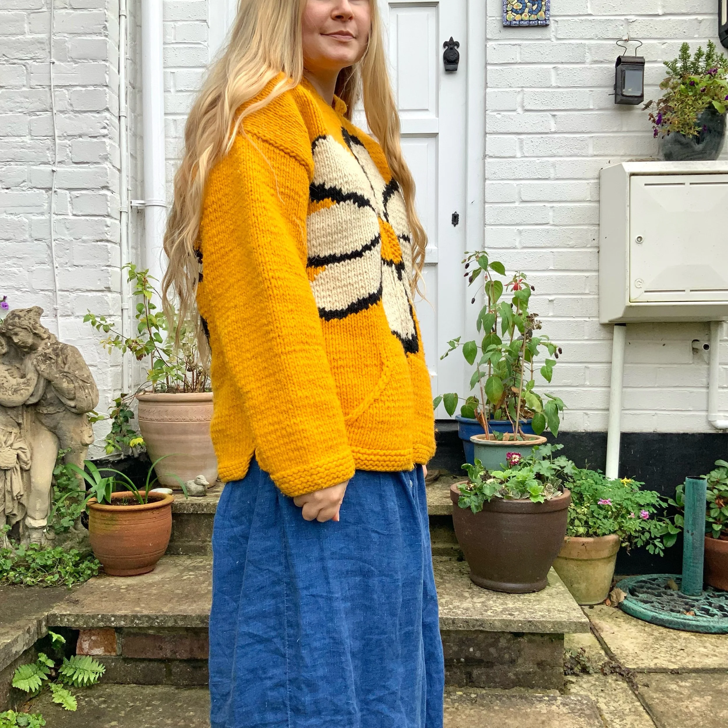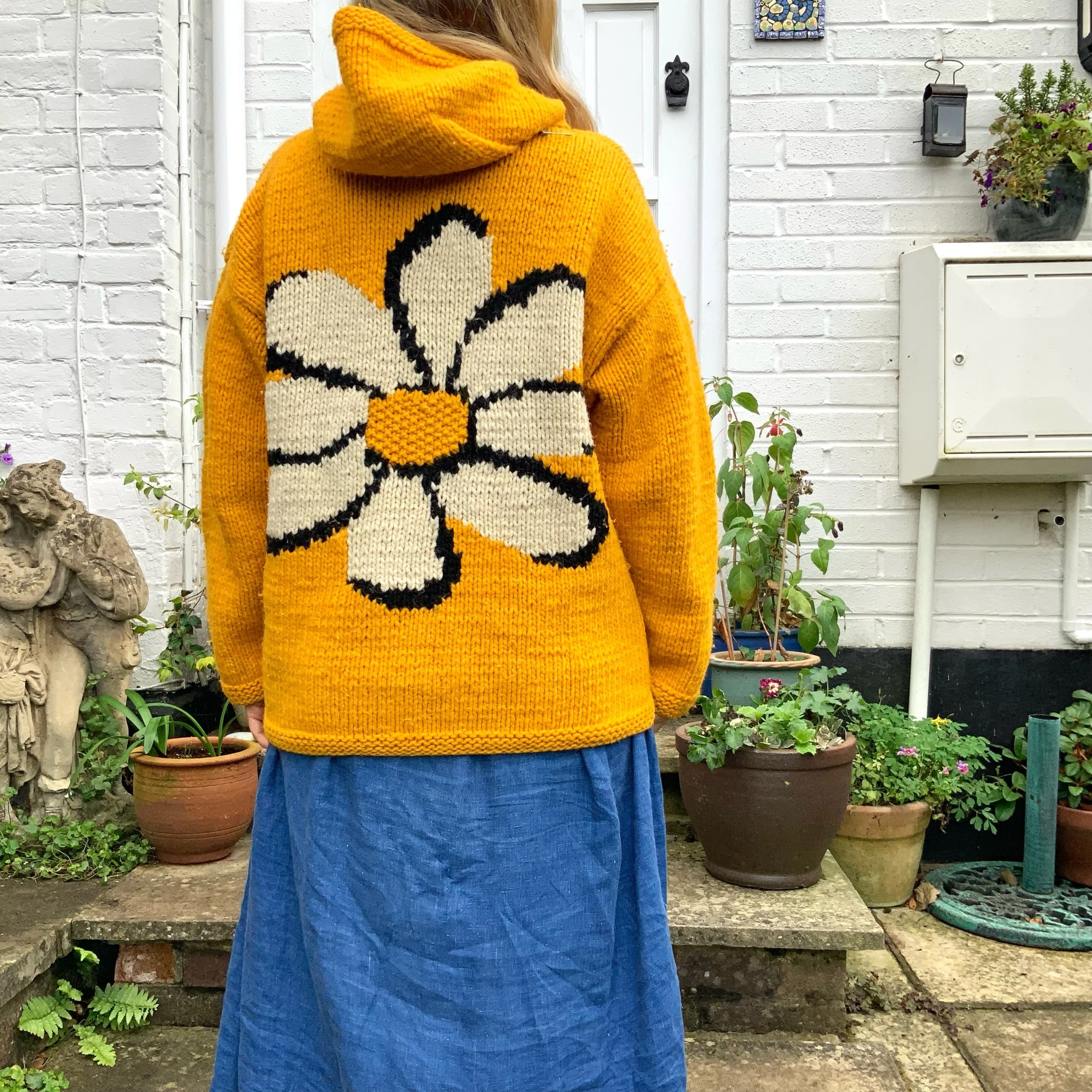 Handmade daisy cardigan made from chunky wool. No brand or size label, I would estimate that it’s around an M, shown on a size S, 5’4 height. Measurements below. :) In great condition. ✨