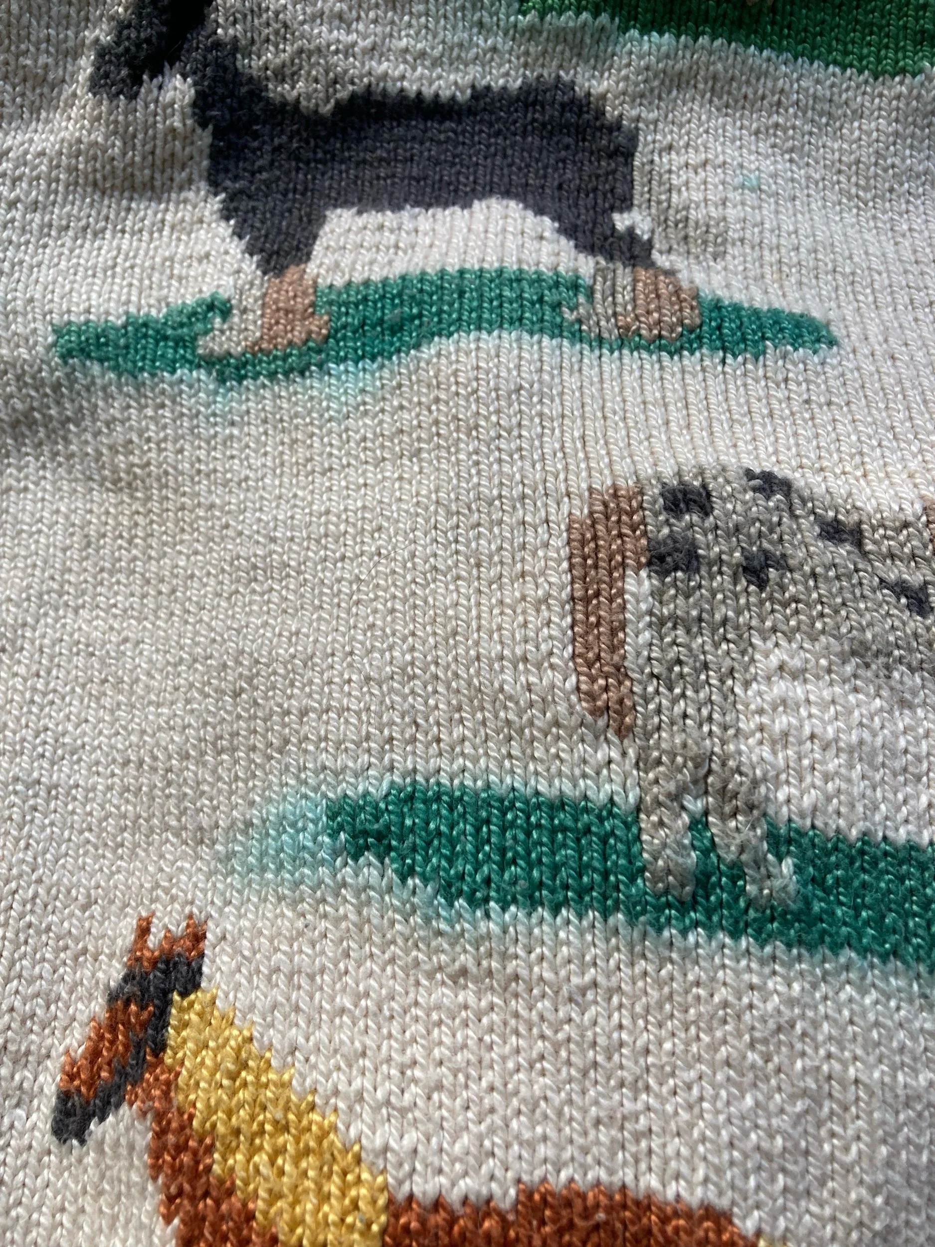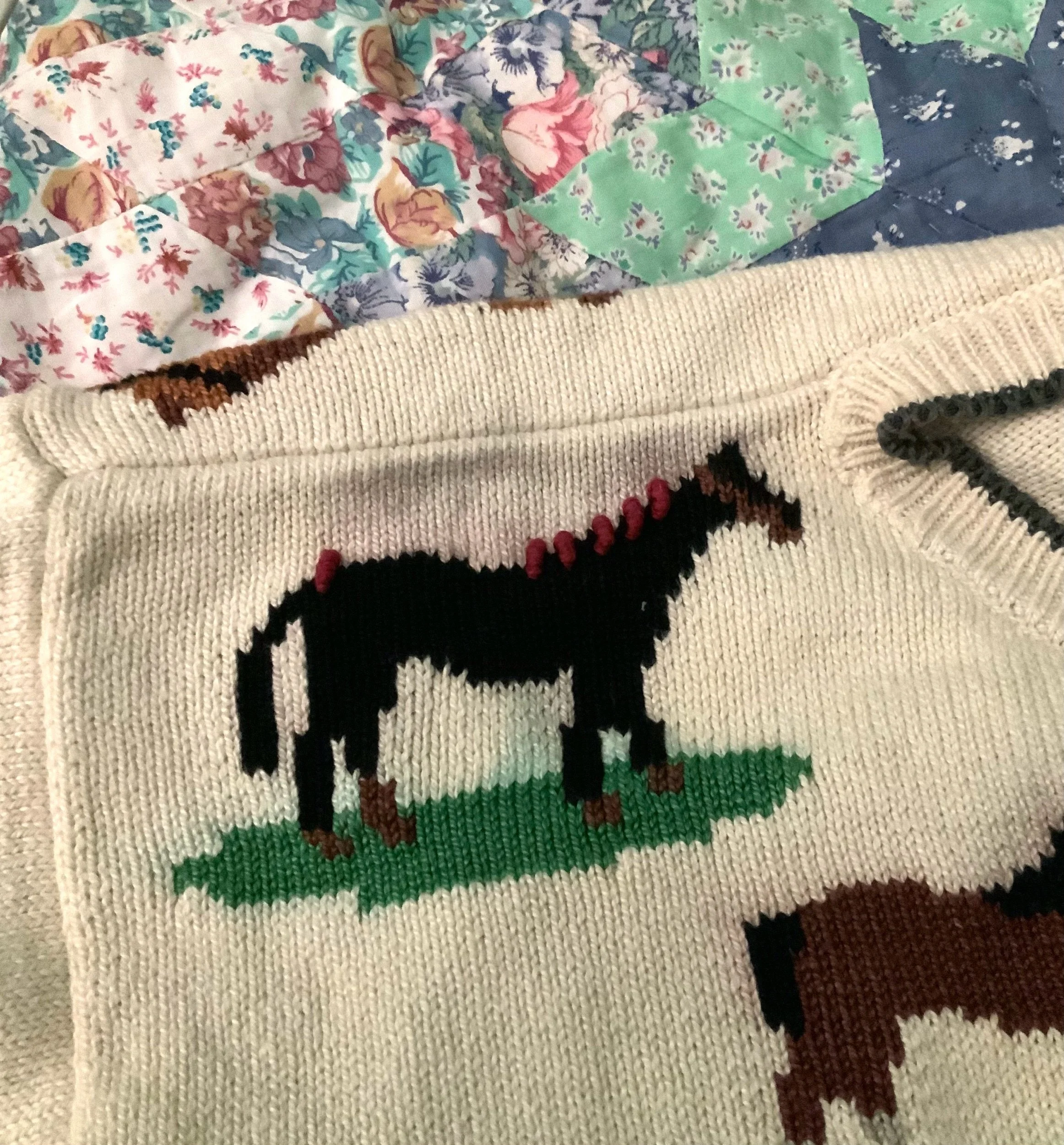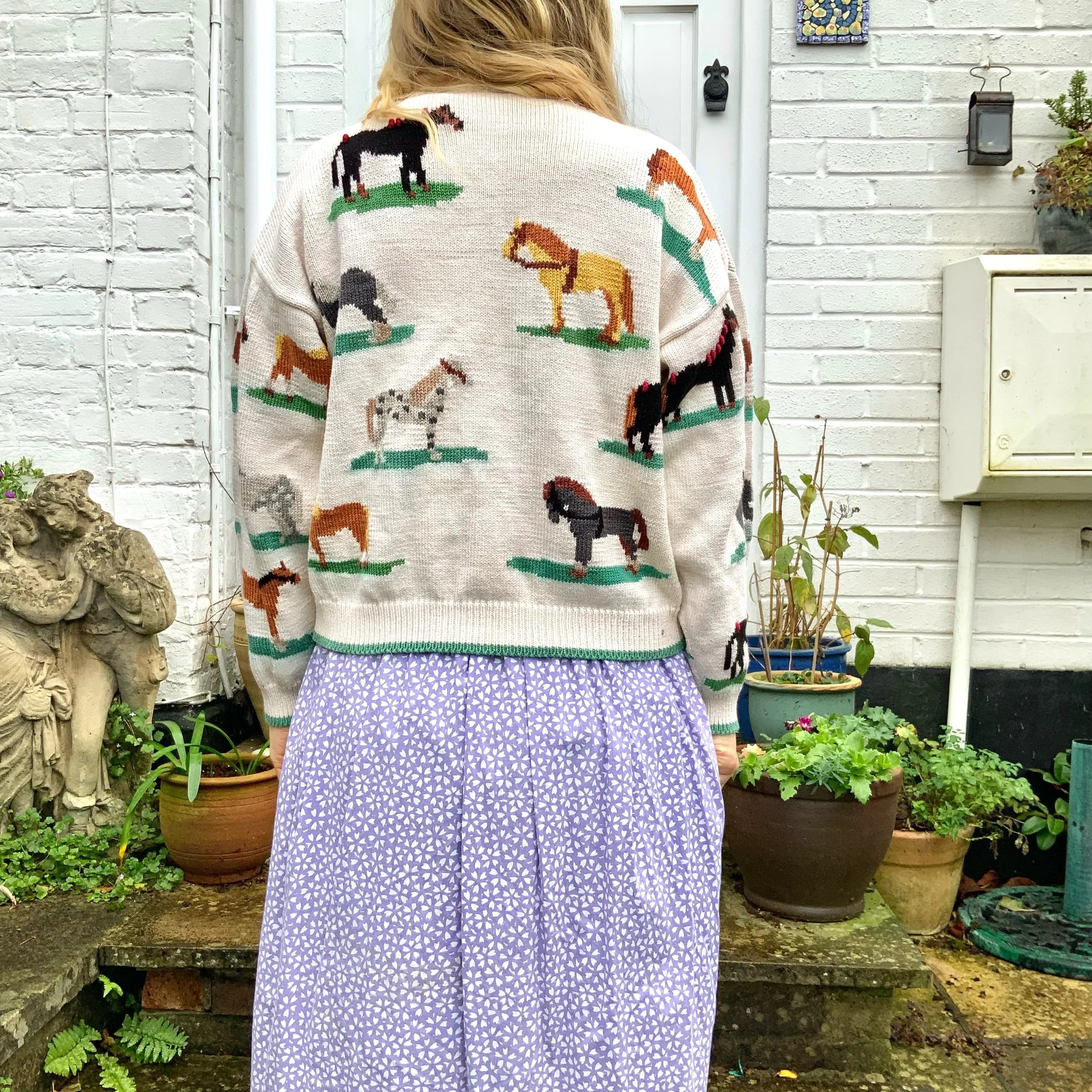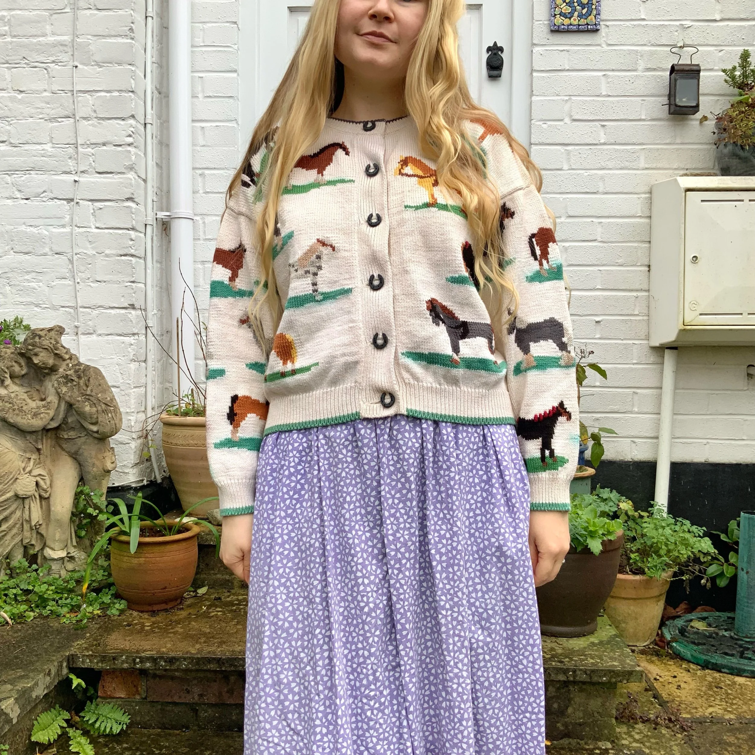 Vintage handknitted horses cardigan. π The brand is Christine Foley and itβs been made from cotton yarn. Size US 2, shown on a size S, 5β4 height. Measurements below. :) In good condition, it has some dye spread in areas.. examples shown in the last photos. β¨