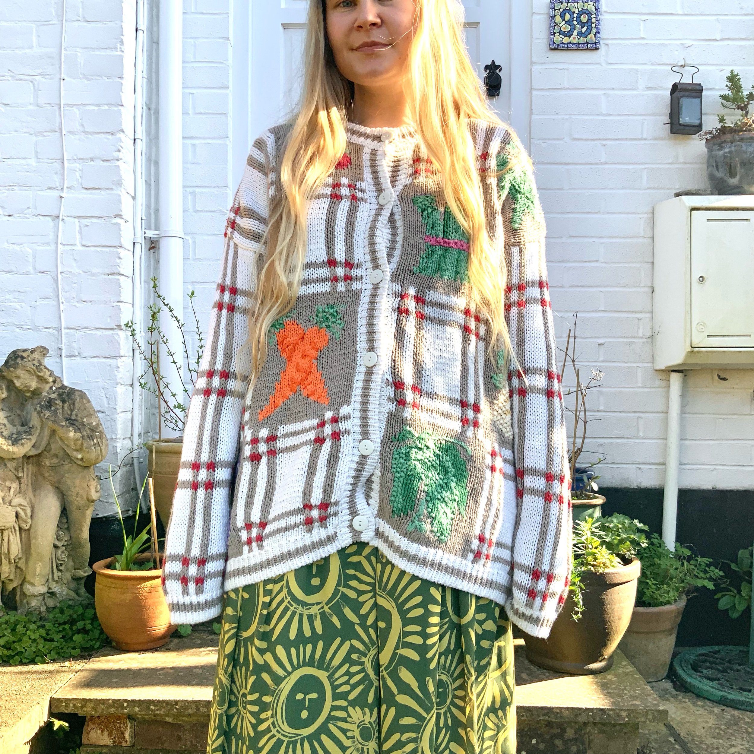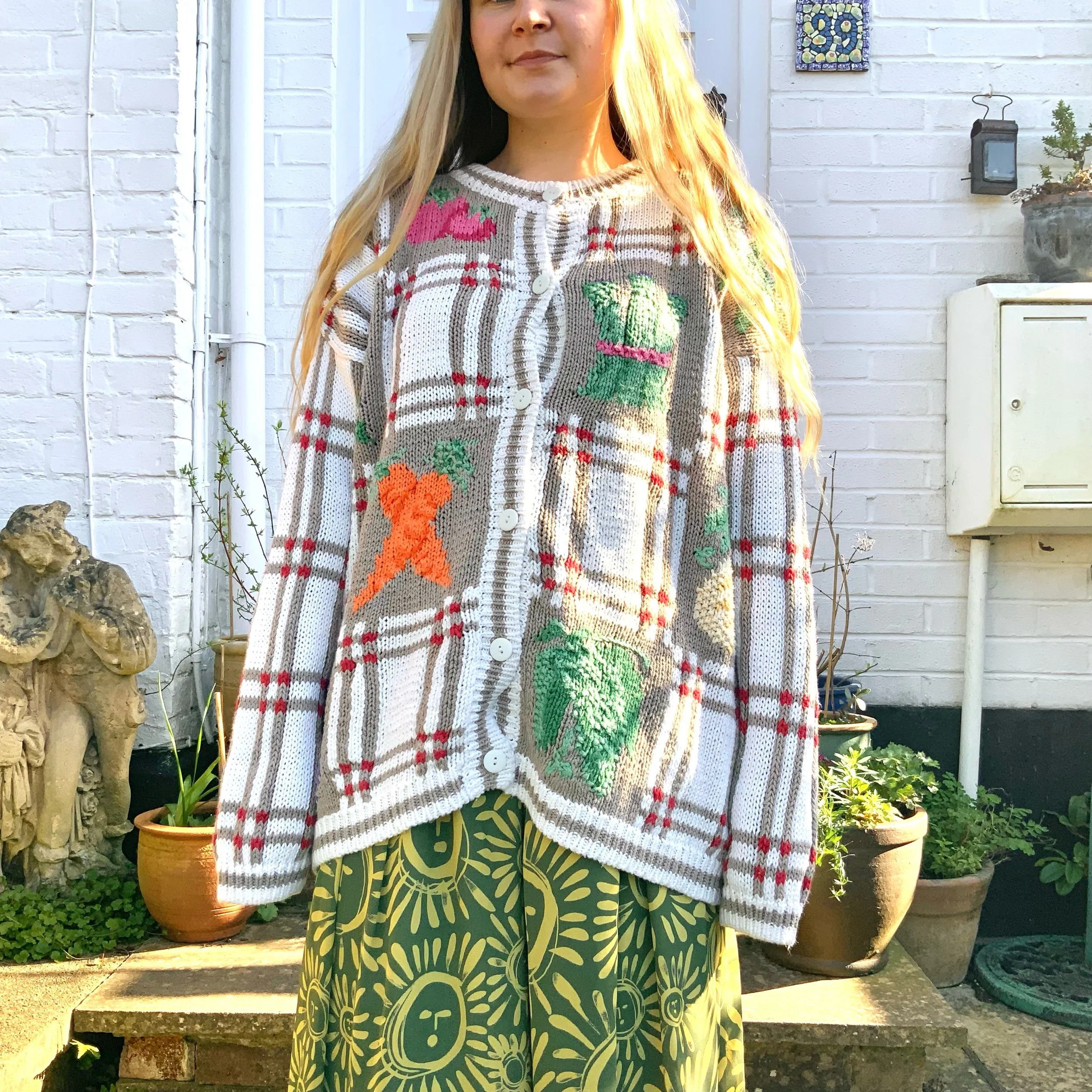 Vintage cardigan with vegetable motifs by the brand Cape Isles. 🥕🥦 Size XL, measurements below. :) Shown on a size S, 5’4 height. Made from 55% ramie and 45% cotton yarn. In great condition. ✨