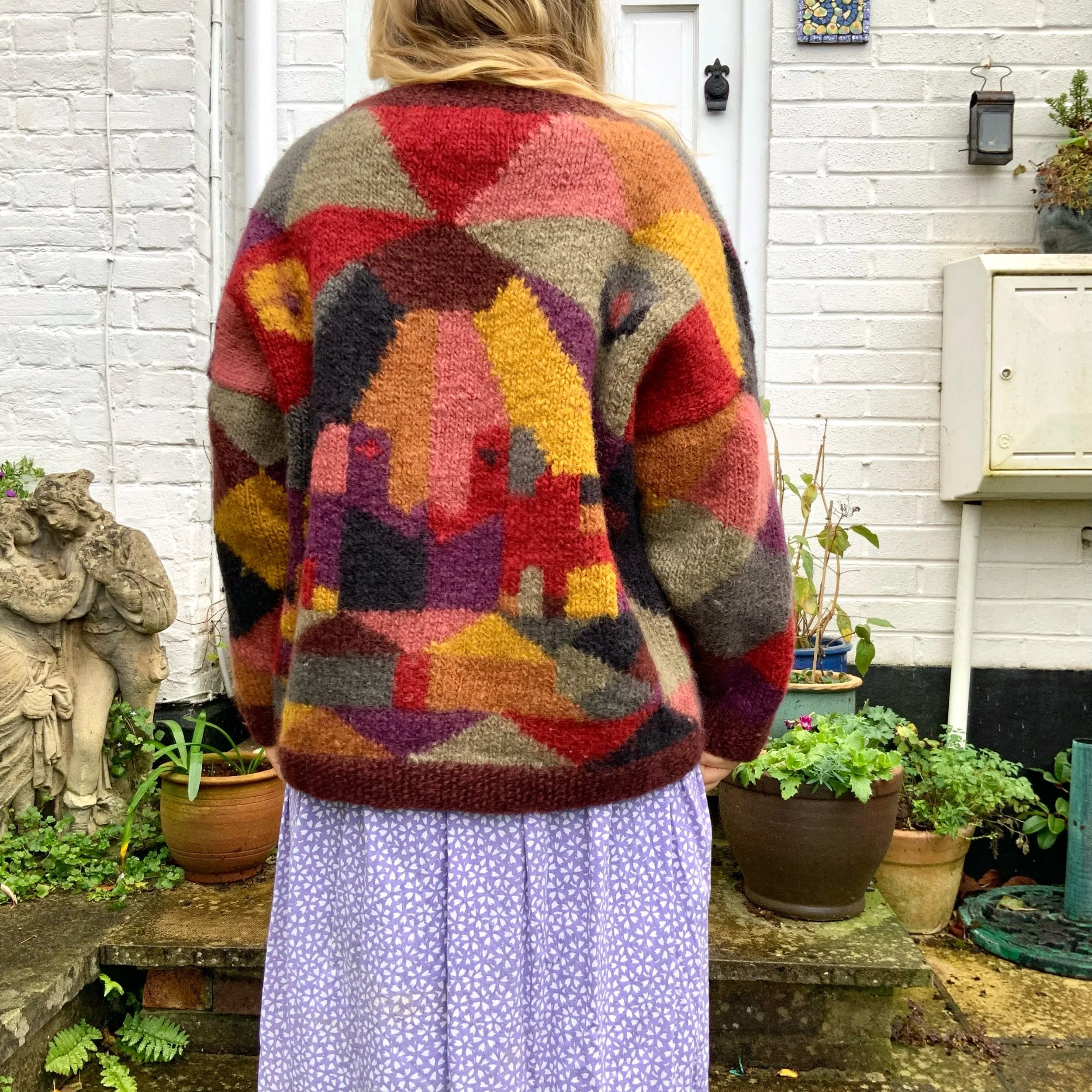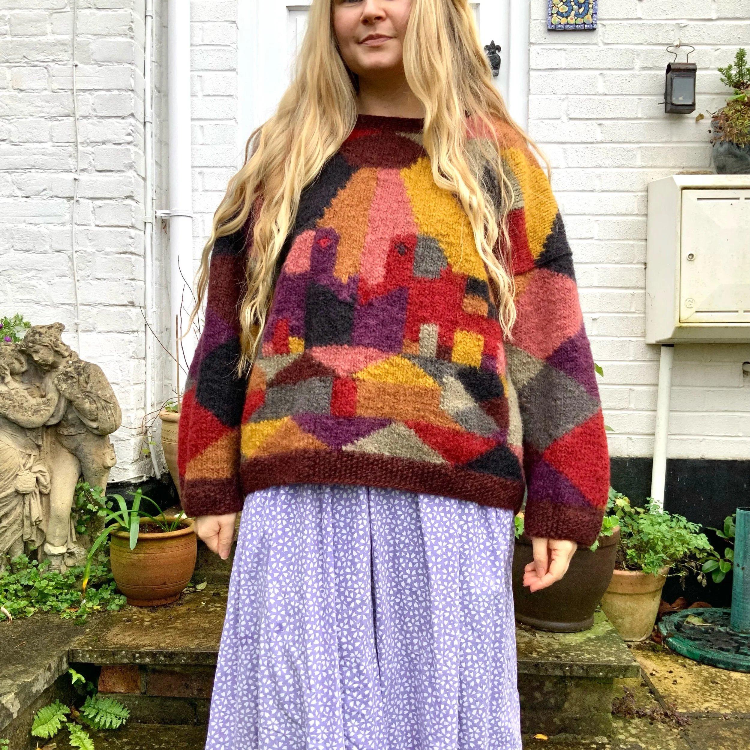 Handmade colourful jumper featuring geometric and elephant motifs. 🤎 Size L, see measurements below. :) Made from naturel wool by the brand Nvevo Americana. In great condition. ✨