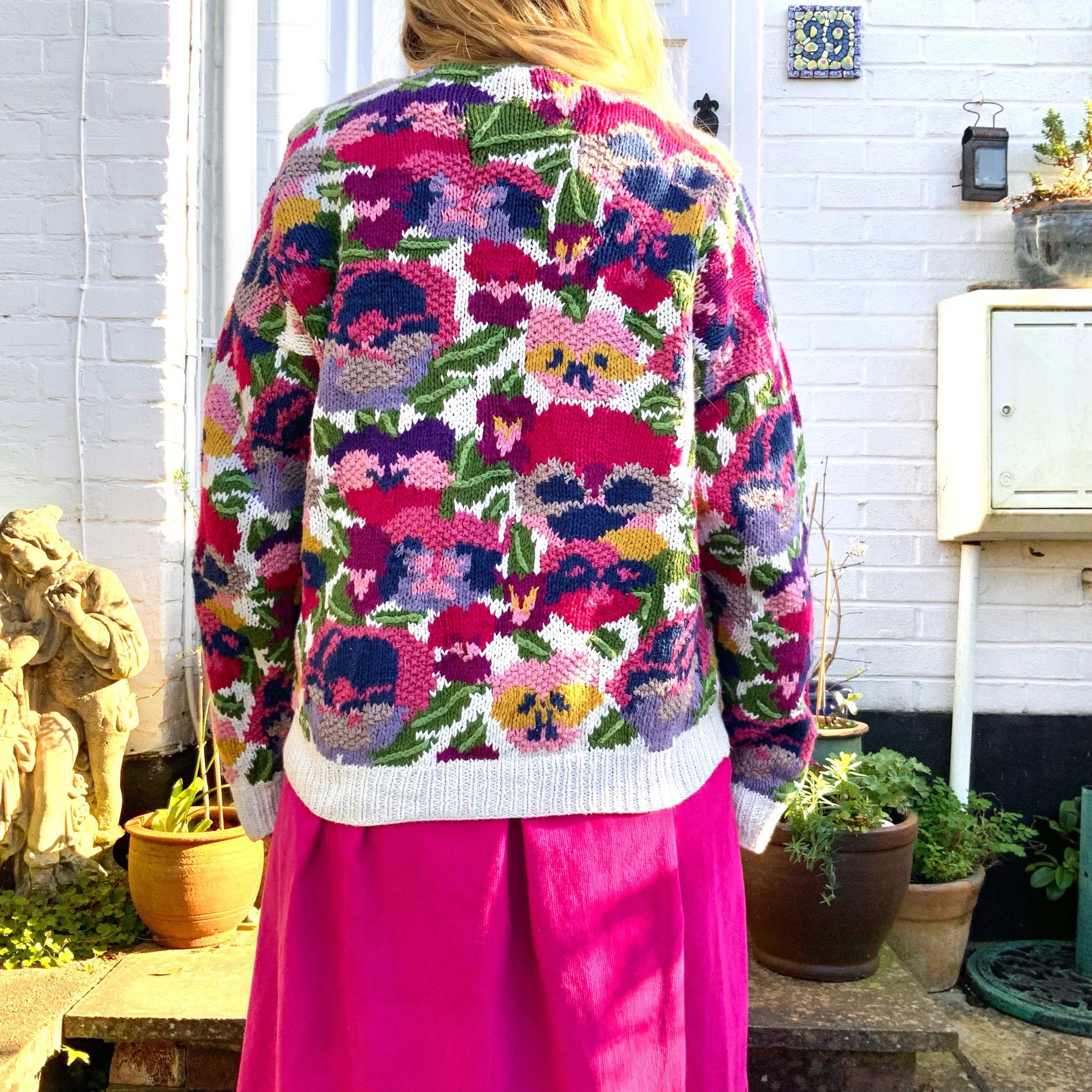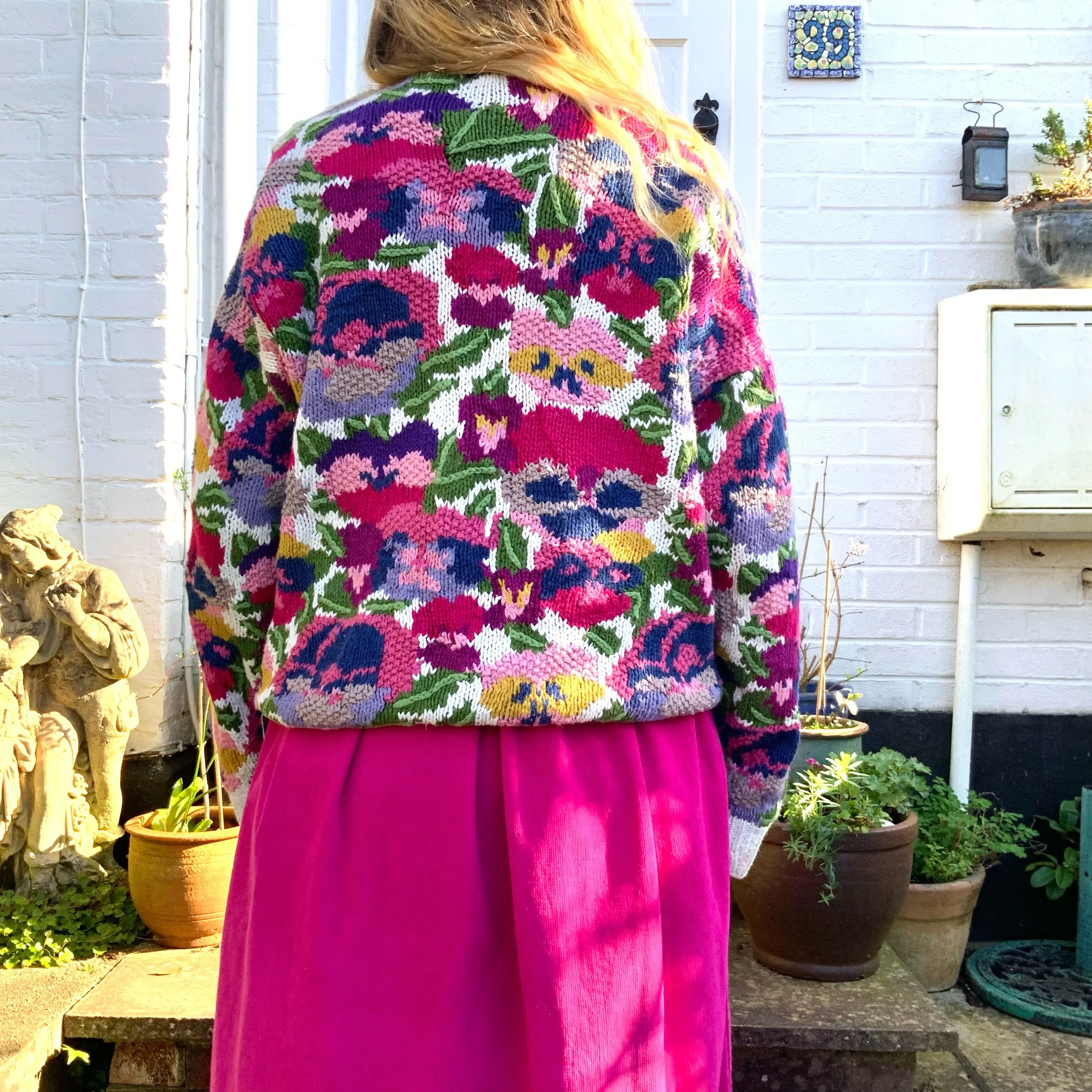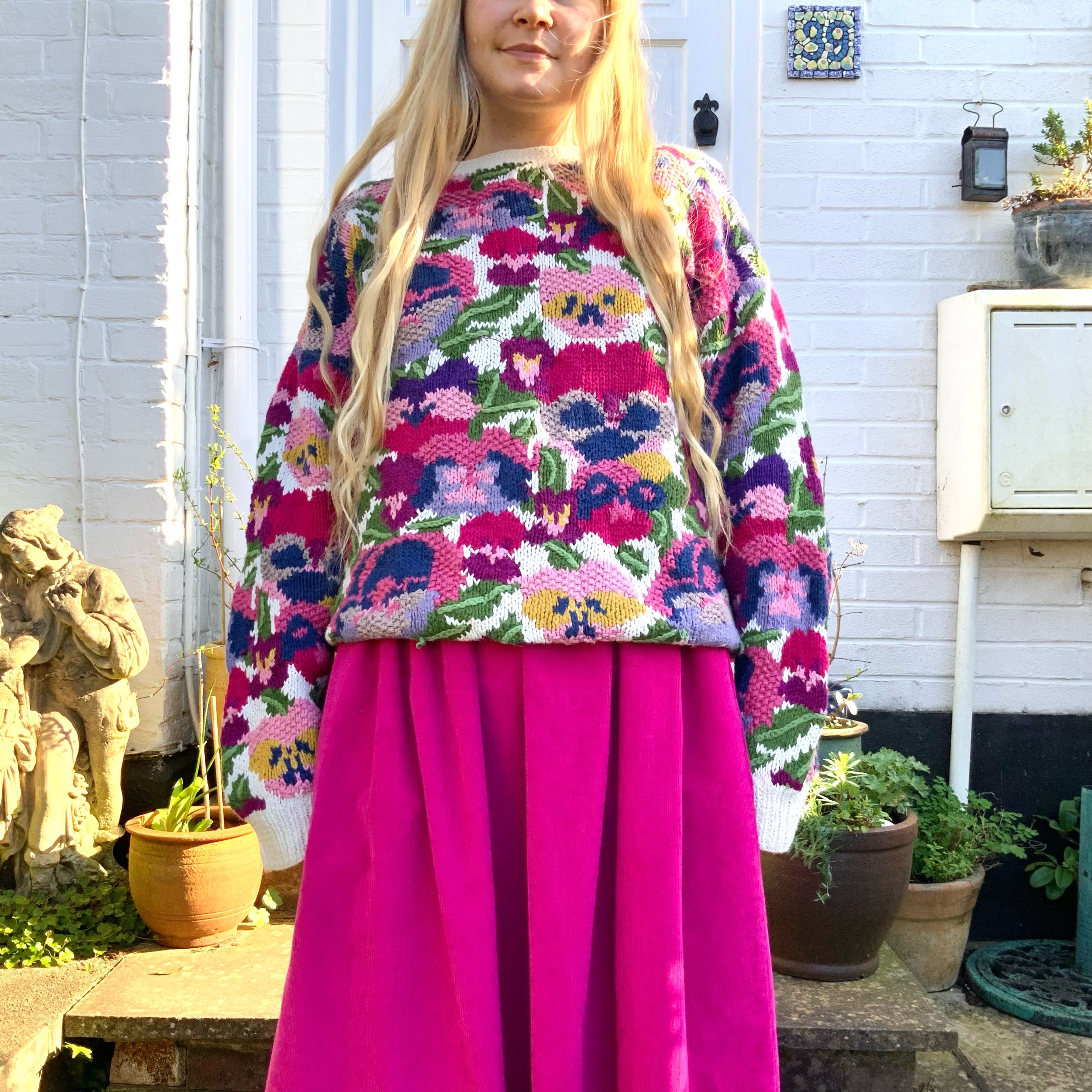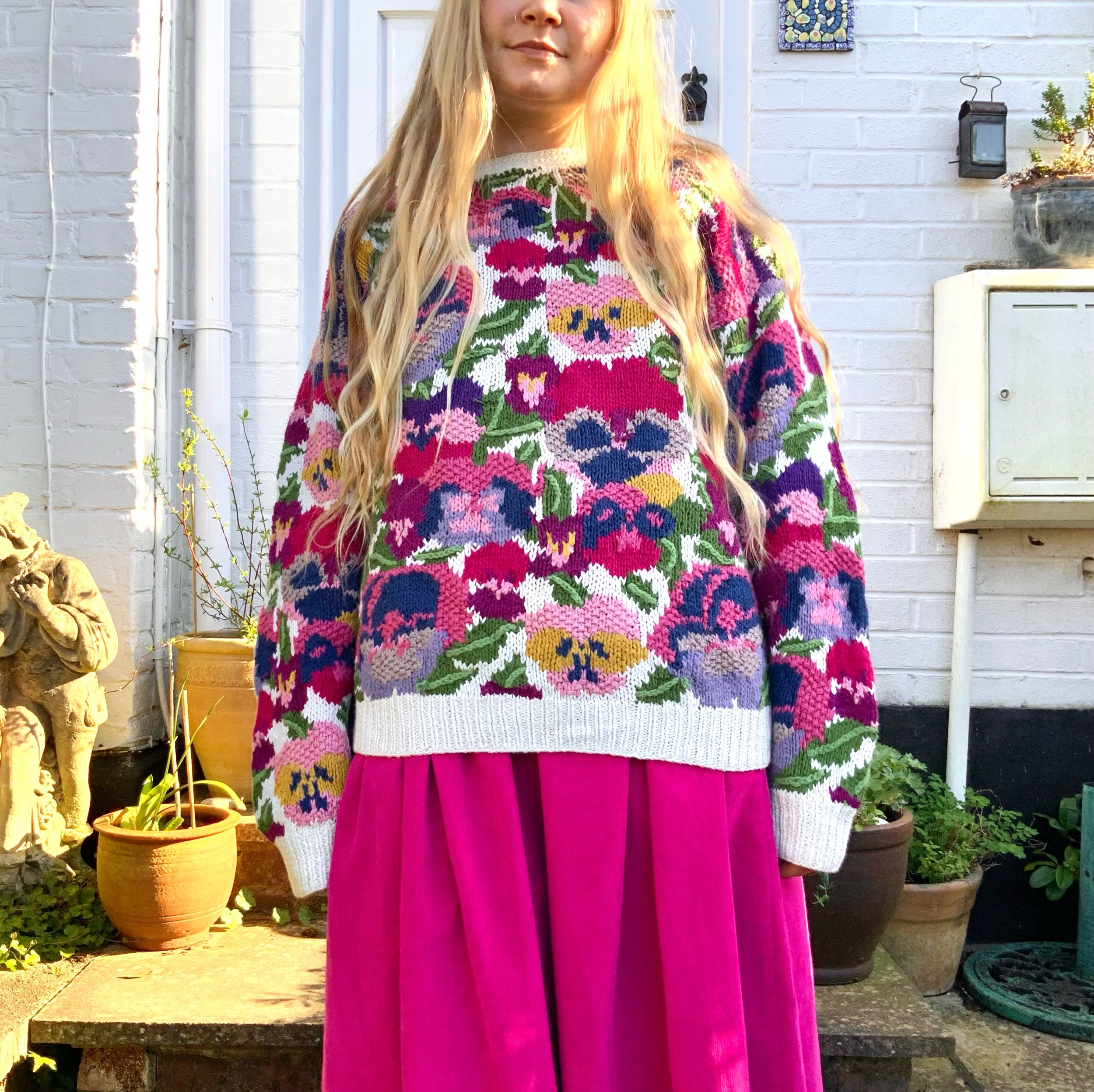 Vintage pansy jumper, handknitted by the brand Northern Isles. 🌸 Made from 55% ramie and 45% cotton yarn. Size XL, measurements below. :) Shown on a size S, 5’4 height. In great condition, one mark shown in the last photo. 🌸
