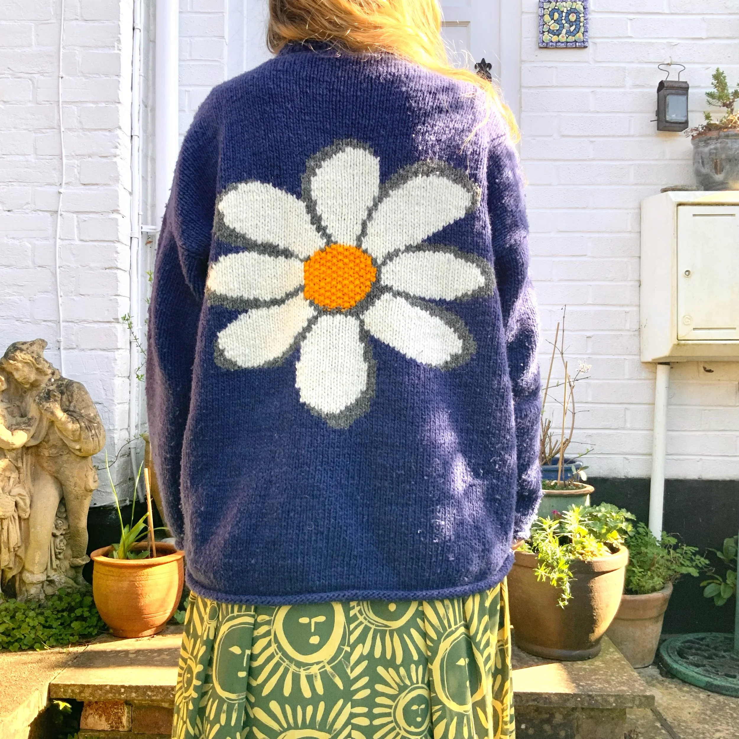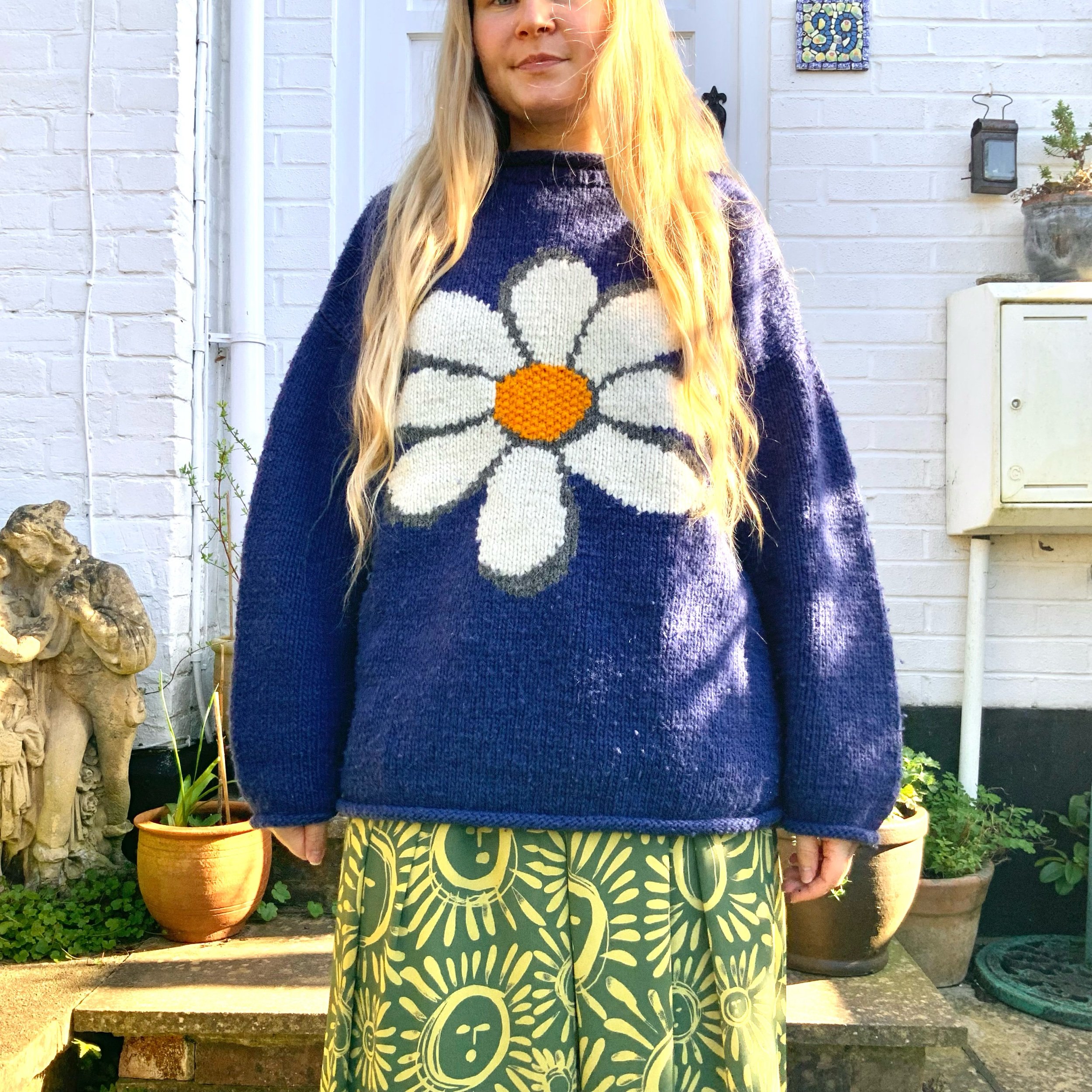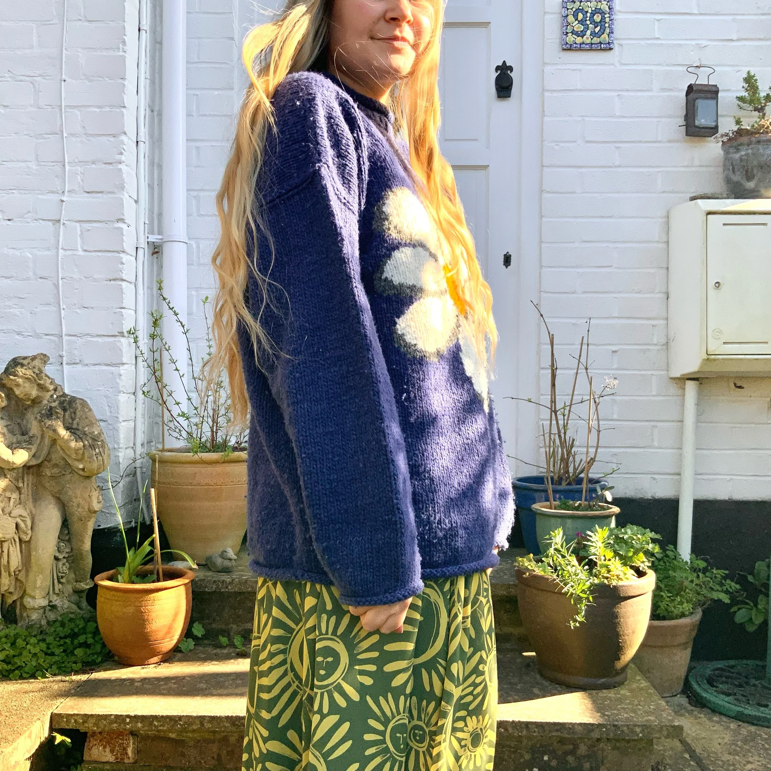 A hand made floral knit made from chunky natural wool by the brand Pachamama. I would estimate that itโs around an XL, shown on a size S, 5โ4 height. Measurements below. :) It does have some bobbling, Iโll do my best to debobble before posting but some might remain. ๐ผ
