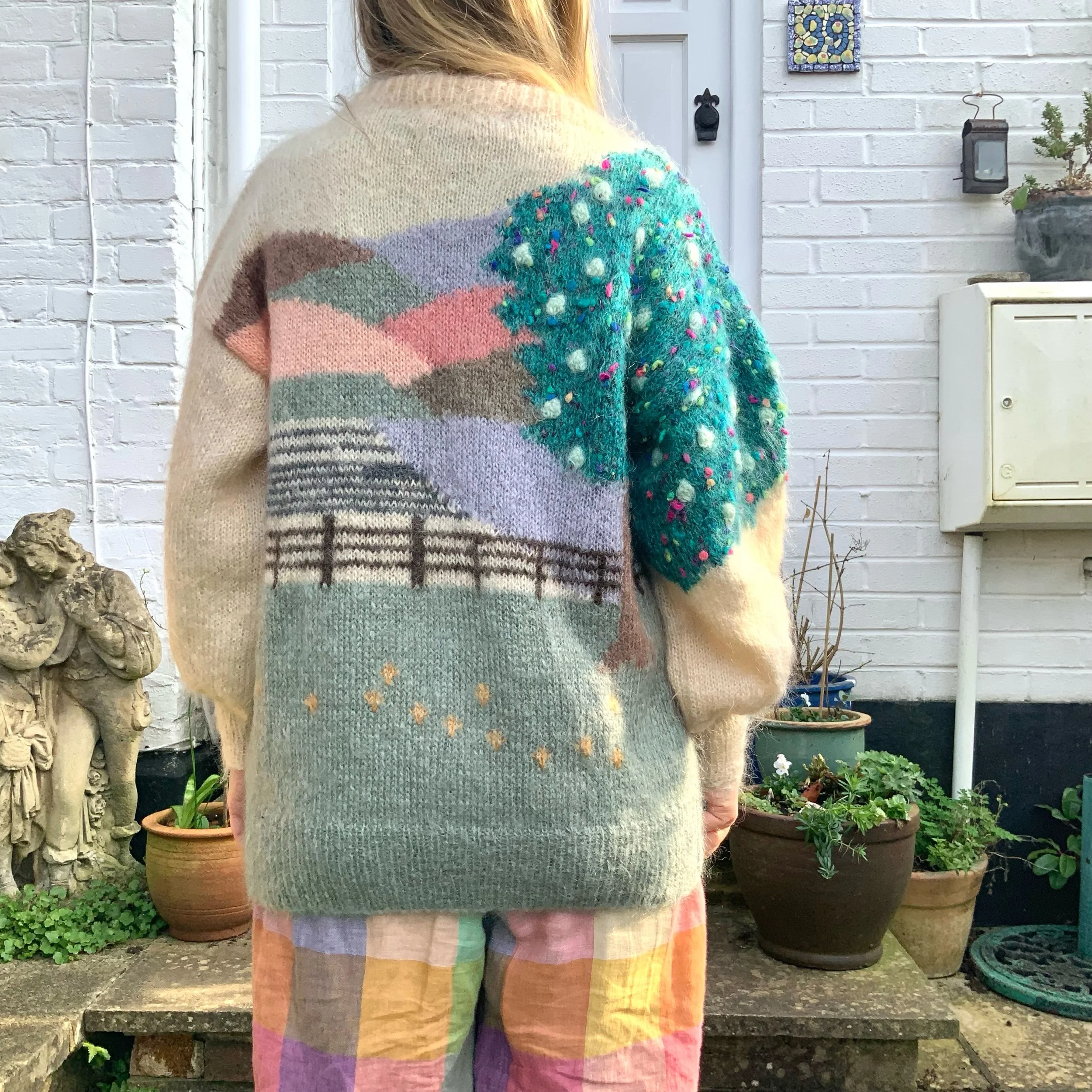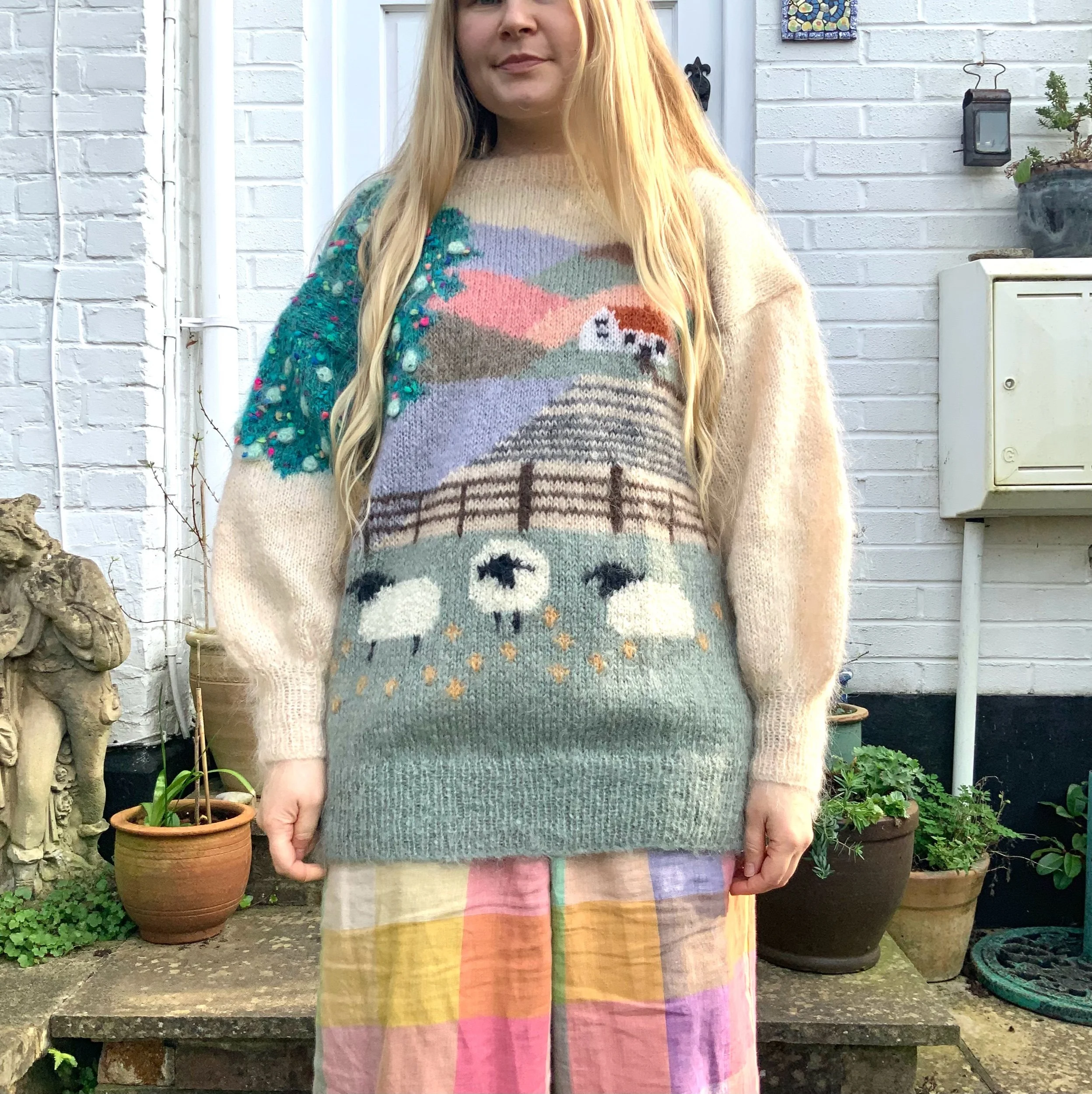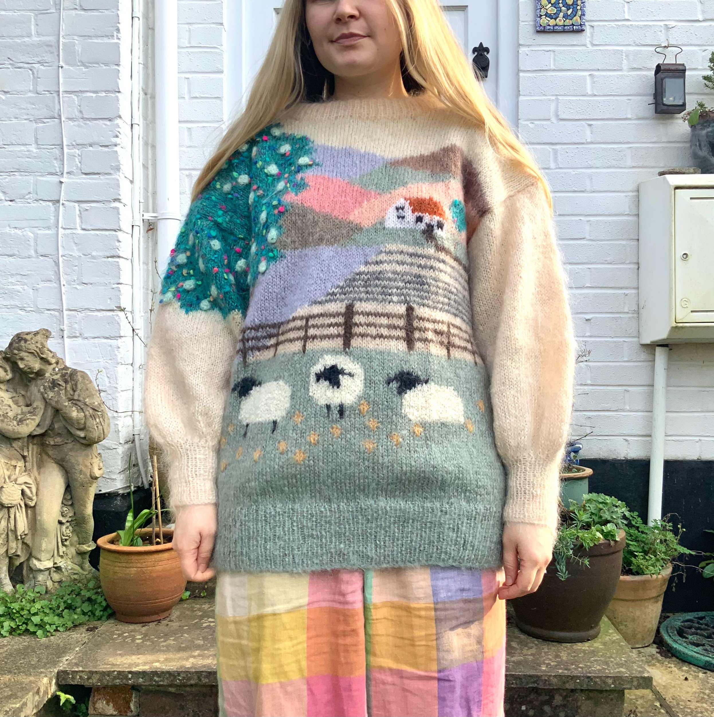 Vintage rare jumper by the knitwear designer Susan Vale.π Hand-knitted in the UK in fluffy mohair yarn, selling on behalf of @yoyothericecorpse. βΊοΈ Iβd estimate that itβs approx a size L, shown on a size S, 5β4 height. Measurements below. :) In great condition, one small mark on a sleeve shown in the last photo. β¨