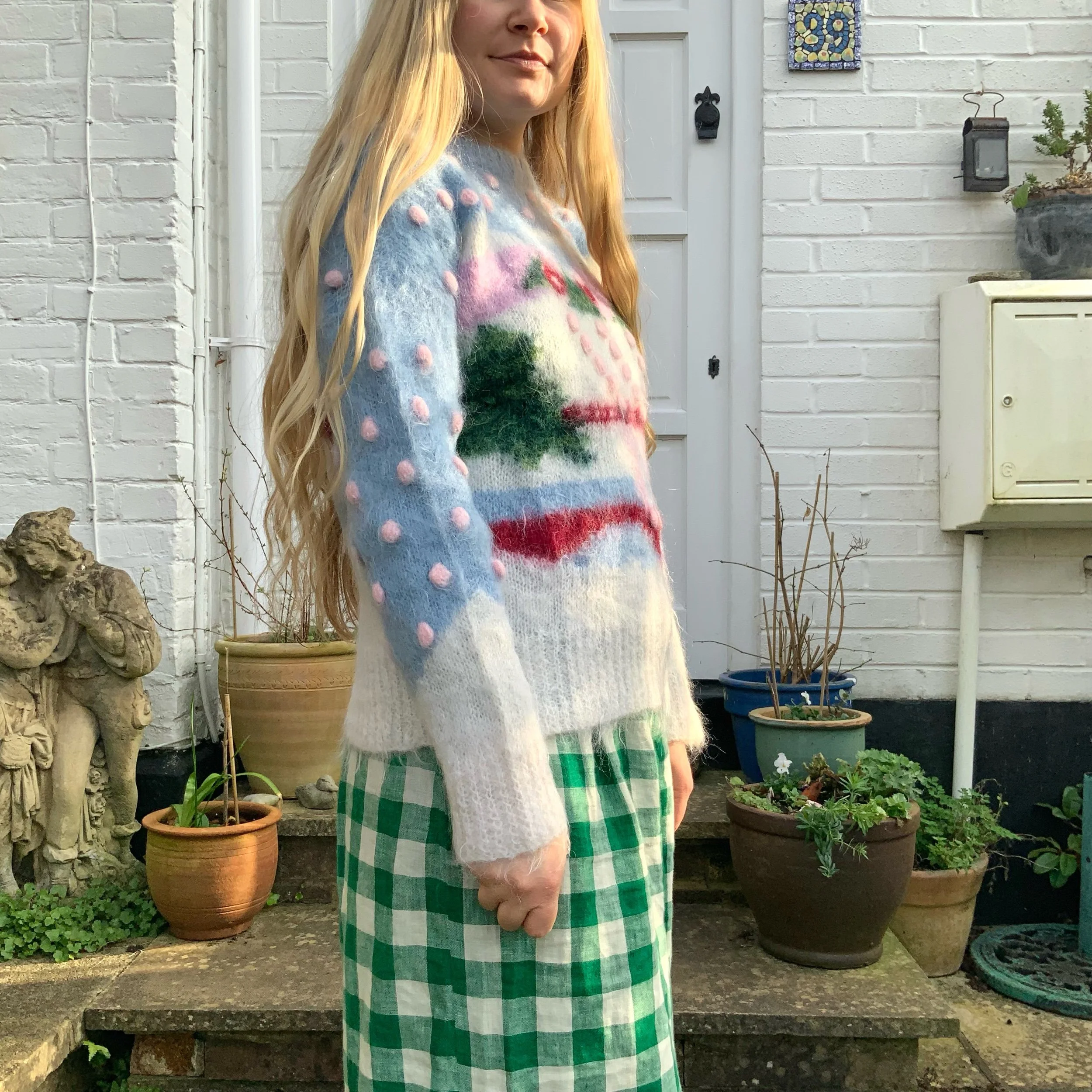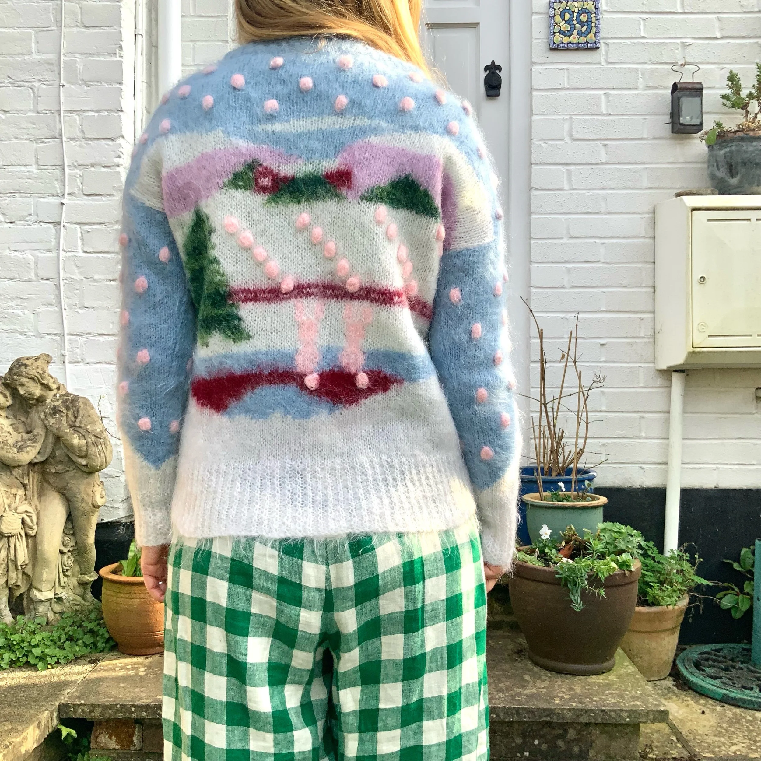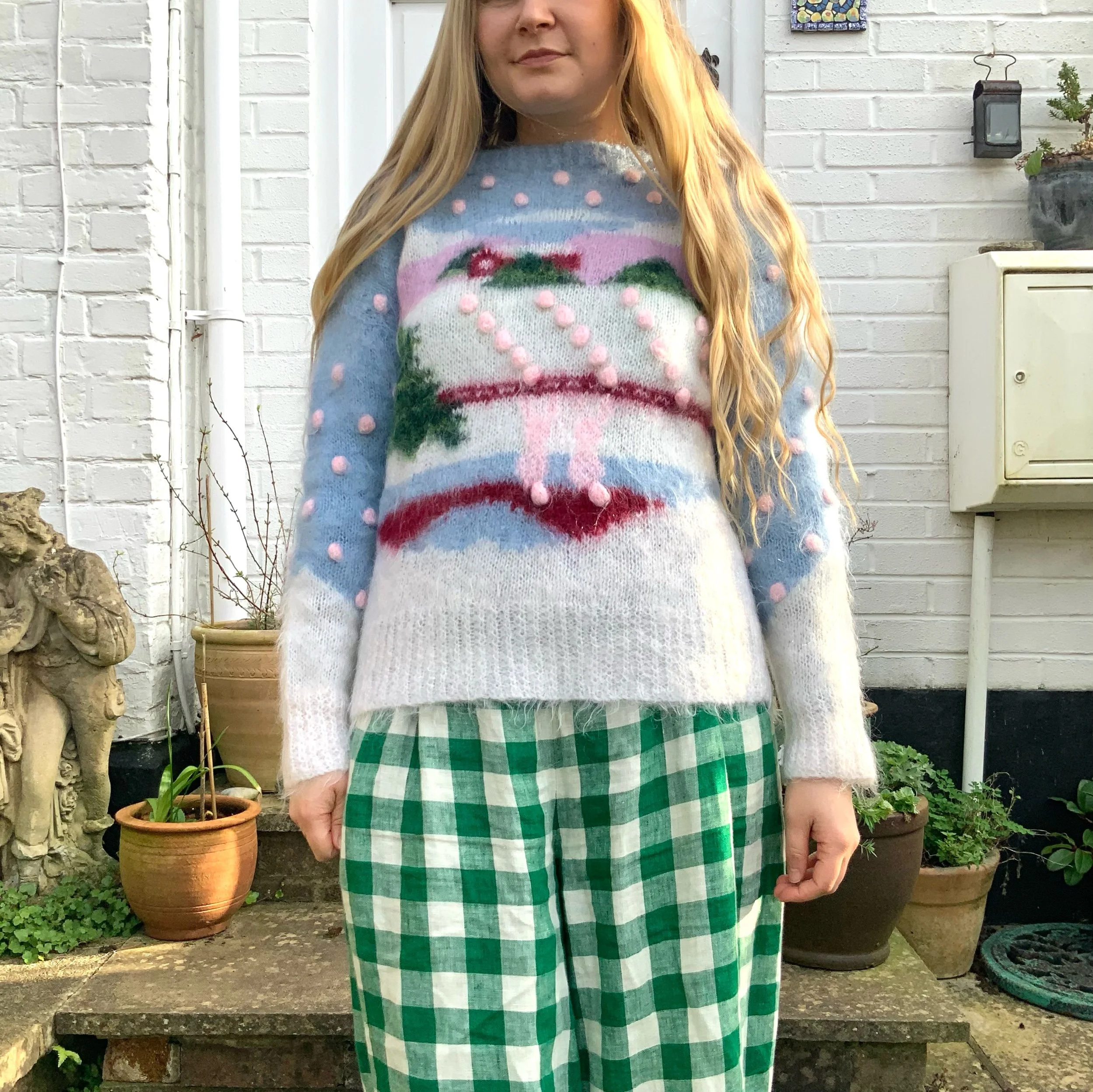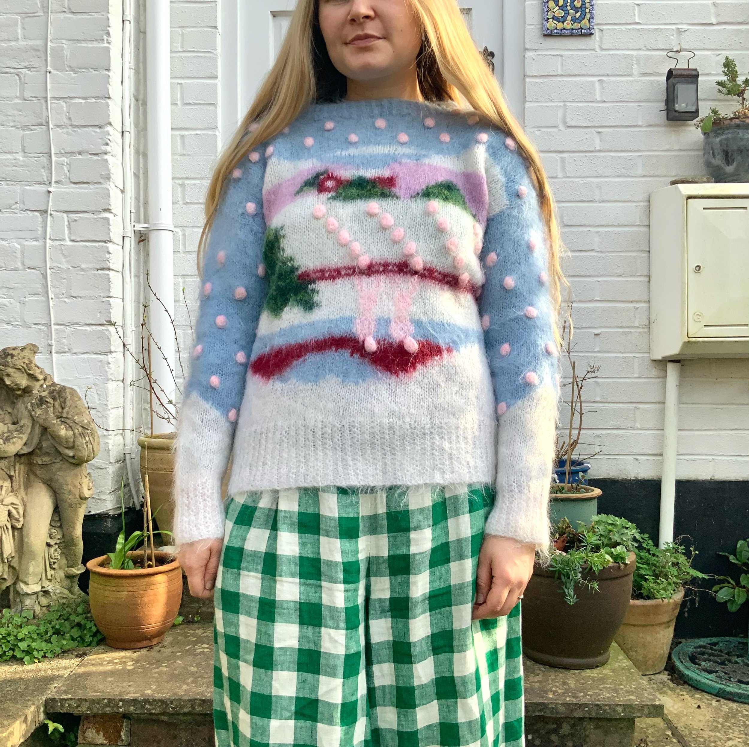 Handmade snowy vintage jumper, likely to be a Susie Lee but there’s no official label. ❄️ Hand-knitted in the UK in fluffy mohair yarn, selling on behalf of @yoyothericecorpse. ☺️ I’d estimate that it’s approx a size S, shown on a size S, 5’4 height. Measurements below. :) In great condition. ✨